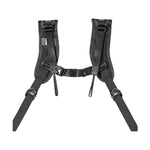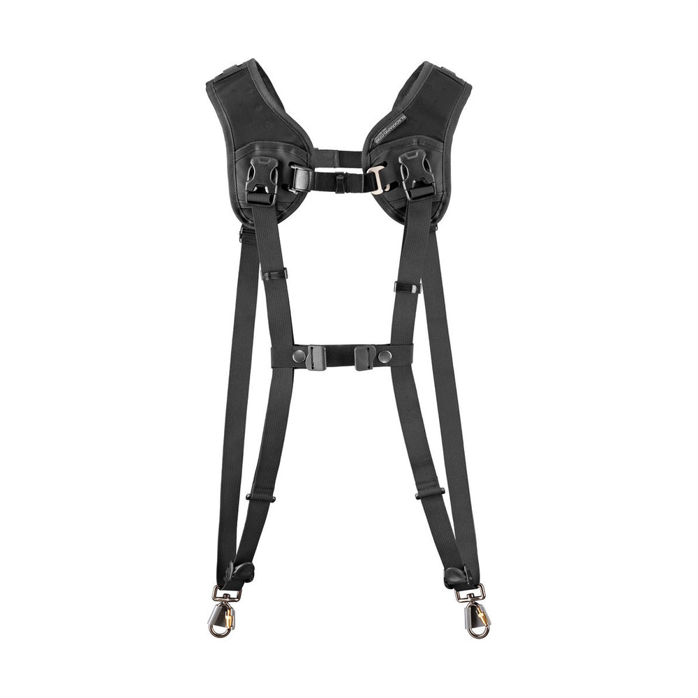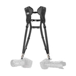 La longitud de cada cinta es ajustable de 36,0 a 63,0" y mide hasta 1,0" de ancho. Los cierres de parachoques con resorte que se pueden deslizar hacia arriba y hacia abajo a lo largo de las correas de la correa hacen que sea especialmente fácil limitar el exceso de movimiento de la cámara cuando se utiliza Double Breathe. Además, las correas de una correa de respiración para binoculares BlackRapid disponible por separado se pueden conectar a la parte frontal de este arnés para que pueda sostener un binocular o una tercera cámara contra el pecho del usuario.