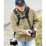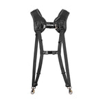 Este arnés para cámara BlackRapid Double Breathe tiene capacidad para dos cámaras permitiéndoles colgar de los hombros derecho e izquierdo. Luego, las cámaras pueden descansar boca abajo a lo largo de las caderas derecha e izquierda para poder levantarlas rápidamente para su uso. Incluso cuando se conecta a dos cámaras grandes con sus lentes incorporados, el Double Breathe sigue siendo cómodo de usar gracias a sus almohadillas de malla resistentes y transpirables que amortiguan la espalda y los hombros. La estructura de las almohadillas optimiza la circulación de aire entre el usuario y el arnés, lo que elimina y minimiza la transpiración en ambientes cálidos y calurosos. Para aquellos con una constitución delgada o pequeña, se puede elegir el arnés de cámara Double Slim Breathe para un mejor ajuste.