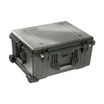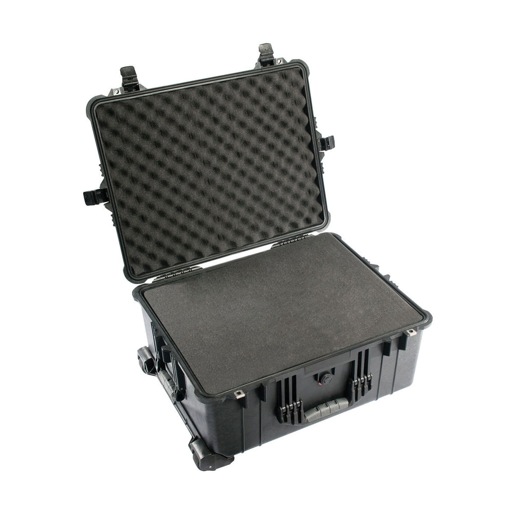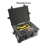 El estuche Pelican 1610 con juego de espuma (negro) es un estuche rígido irrompible, hermético, hermético, a prueba de polvo, resistente a productos químicos y a la corrosión que se utiliza para transportar cualquier tipo de equipo. Está hecho de copolímero estructural de impacto ultraalto que lo hace extremadamente fuerte y duradero. Tiene una junta tórica de neopreno de 0.25" (6.4mm), 4 pestillos de doble tiro de fácil apertura que sellan perfectamente. Tiene una válvula de ecualización de presión automática incorporada para cambios de altitud o temperatura. La caja utiliza herrajes de acero inoxidable y tiene protectores de candado para brindar mayor resistencia y seguridad adicional contra cortes y robos.Se transporta mediante 3 cómodas manijas de transporte de goma sobremoldeadas, un asa retráctil y ruedas incorporadas.