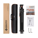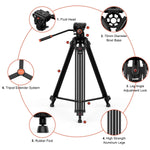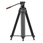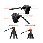 Este trípode de vídeo Geekoto DV2 es un sistema de base de media bola de 70 mm que soporta hasta 33 lb / 14.97 kg y tiene un arrastre fijo de giro/inclinación, con contrapeso fijo. Tiene una placa de equilibrio de cámara deslizante con 1.77" de equilibrio de recorrido. Las patas cuentan con ajuste independiente de extensión y altura y un separador de nivel medio integrado. El sistema tiene un rango de altura de 33 a 72". El cabezal presenta un rango de inclinación de 90 a -70°.
