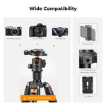 El tripie cuenta con patas de 5 secciones con sistema de bloqueo rápido, lo que permite ajustar la altura con un solo giro. Gracias a su diseño de tubo excéntrico, puedes extenderlo o retraerlo fácilmente según tu estilo de toma, ya sea para fotografía de producto, retratos o video en exteriores.