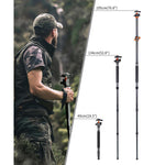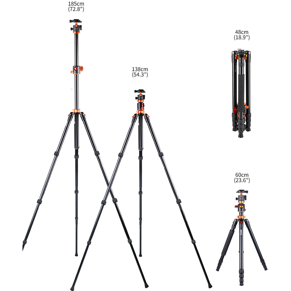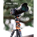 El trípode de aluminio K234A0 para cámara réflex digital de K&F Concept es un trípode de viaje ligero con numerosas características similares a las de trípodes de mayor tamaño. Las patas se pueden colocar de forma independiente para su uso en terrenos irregulares y se abren o cierran rápidamente mediante cierres giratorios. Las patas se pueden invertir para disparos a muy baja altura y plegarse completamente hasta alcanzar una longitud de 46 cm, ideal para viajes. Para disparos que requieren un soporte aún más compacto, una pata extraíble se convierte en un monópode, y la columna central se puede combinar con él para alcanzar una altura máxima de 193 cm. La columna central también se puede extender lateralmente y girar 360° en posición horizontal.