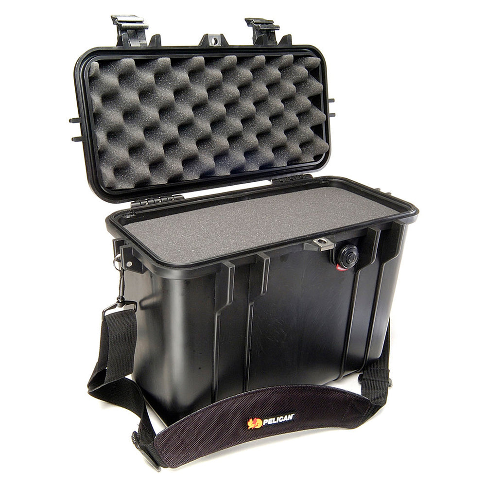 El maletín de carga superior Pelican 1430 con espuma (negro) es un maletín rígido irrompible, hermético, hermético, a prueba de polvo, resistente a los productos químicos y a la corrosión que se utiliza para transportar cualquier tipo de equipo que necesite protección contra los elementos. Está fabricado con copolímero estructural de ultra alto impacto, lo que lo hace extremadamente fuerte y duradero. El maletín tiene una tapa abatible que proporciona un fácil acceso al equipo. Incluye una junta tórica de neopreno de 0.25" (6.4 mm), pestillos de doble cierre ABS que sellan perfectamente y una válvula de ecualización de presión automática para una ecualización rápida después de los cambios en la presión atmosférica. El 1430 tiene un protector de aldaba de acero reforzado y se transporta mediante un asa plegable sobremoldeada de goma.