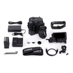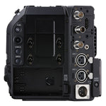 ● La unidad de expansión 2 amplía el factor de forma compacto y agrega dos entradas de audio XLR adicionales, puerto de control de lentes, salida de CC de 24 voltios y alimentación D-Tap, además de genlock, salida de sincronización, control remoto B (RS-422) y un puerto Ethernet. También permite que la cámara se alimente con baterías con montura en V estándar de la industria.
