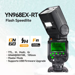 • Equipado con un sistema de disparo por radio de 2.4 GHz compatible con Canon que permite que el YN968EX-RT funcione como maestro o esclavo TTL con Canon 600EX-RT y YN-E3-RT, así como con Yongnuo YN600EX-RT y ST-E3-RT. El flash también puede funcionar como esclavo óptico con soporte para comunicación TTL de sistemas Canon y Nikon.