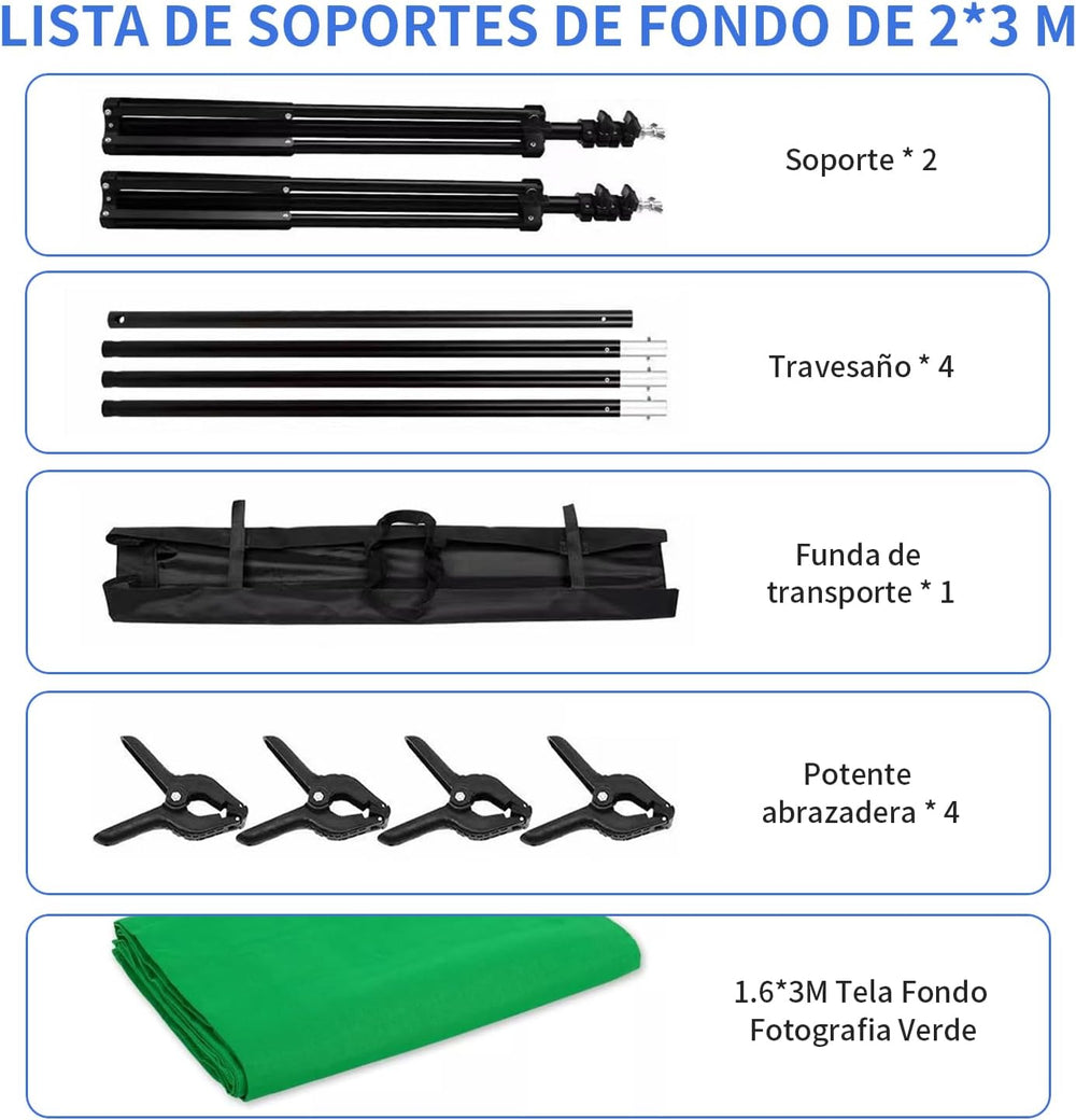 NiceFoto S-30 Características clave ● 2 x Soporte de luz● 1 Telescópico● 4 Pinzas● 1 Tela fondo fotografia verde 3m● 1 Funda de transporte  El Portafondos S-30 es el complemento...