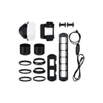 El JJC FDA-S1 incluye un cilindro, ocho adaptadores, un soporte para diapositivas, un soporte para tiras de película y una luz LED.