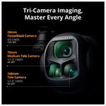 El Infinity Gimbal incorpora tres lentes que permiten a los pilotos capturar imágenes y videos de una gran variedad de contenido, con énfasis en la naturaleza, la arquitectura y la vida silvestre. El más avanzado es un gran angular de 100 MP, diseñado por Hasselblad, con apertura ajustable para capturar imágenes nítidas con poca luz y efectos de destellos de 10 rayos. El video alcanza una impresionante resolución HDR de 6K60 compatible con la Solución de Color Natural Hasselblad (HNCS), un reconocido estándar de fidelidad de color. A este se suman un teleobjetivo medio de 48 MP para perspectivas comprimidas que resaltan sujetos en retratos, y un teleobjetivo estándar de 50 MP para obtener resultados increíblemente nítidos a larga distancia que reducen la percepción de profundidad y aplanan la perspectiva. Los tres comparten un envidiable conjunto de características adicionales.