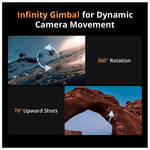 El exclusivo estabilizador Infinity con forma esférica ofrece un amplio rango de movimiento que incluye una rotación de 360°. Esto te permite lograr ángulos holandeses aéreos y otros movimientos creativos, dramáticos y que desafían la gravedad. También es capaz de disparar 70° hacia arriba, permitiéndote capturar encuadres impresionantes de montañas y altas estructuras urbanas.