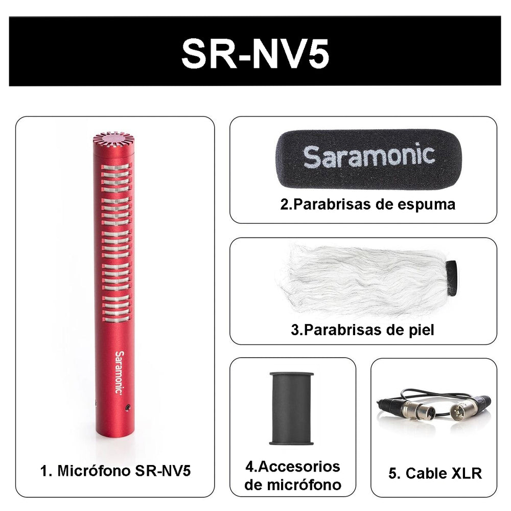 Saramonic SR-NV5 Características clave● Para transmisiones, películas e ENG● Patrón polar cardioide● Salida de bajo ruido y alta sensibilidad● Respuesta de frecuencia de 40 Hz a 18 kHz● Requiere alimentación...