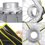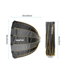 NiceFoto EM-Φ90cm Características clave● Montaje Bowens● Tamaño de la caja de luz (diámetro):● 90cm● Peso del paquete: Contenido:1. Caja suavizadora2. Estuche de transporte3. Cuadrícula 4. Paño suave Descripción general de...