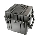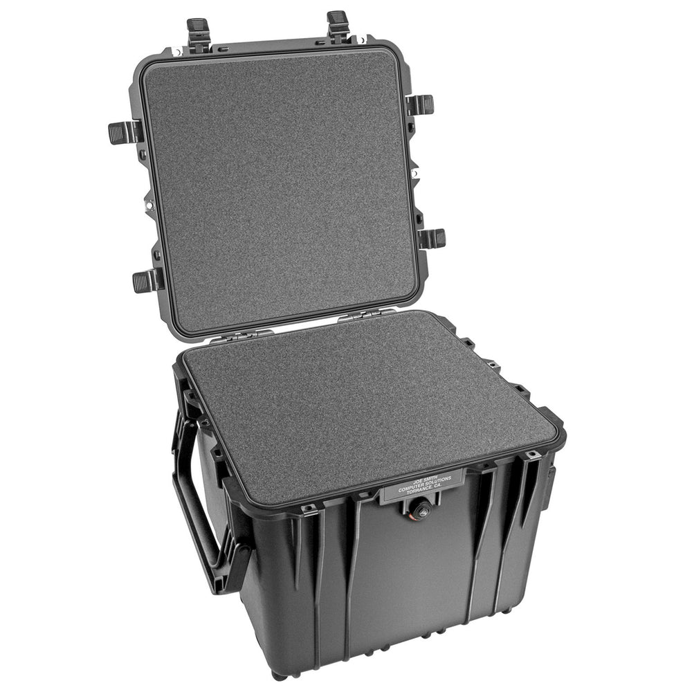 El maletín cúbico Pelican 0340 con espuma es extra profundo, irrompible, hermético, a prueba de polvo, resistente a los productos químicos y a la corrosión. Está hecho de copolímero estructural de impacto ultra alto que lo hace extremadamente fuerte y duradero. El maletín se cierra con seis pestillos dobles de ABS (dos a cada lado, dos al frente) para mantener un sello hermético. Hay una válvula de ecualización de presión automática, seis pestillos de doble apertura de fácil apertura y protectores de candado. El maletín cúbico 0340 se puede transportar con sus dos grandes asas plegables para dos personas o con su asa de tracción con resorte incorporada y ruedas. Se incluye un juego de espuma de siete piezas.